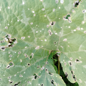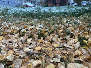 An autumn leaf with speckles.