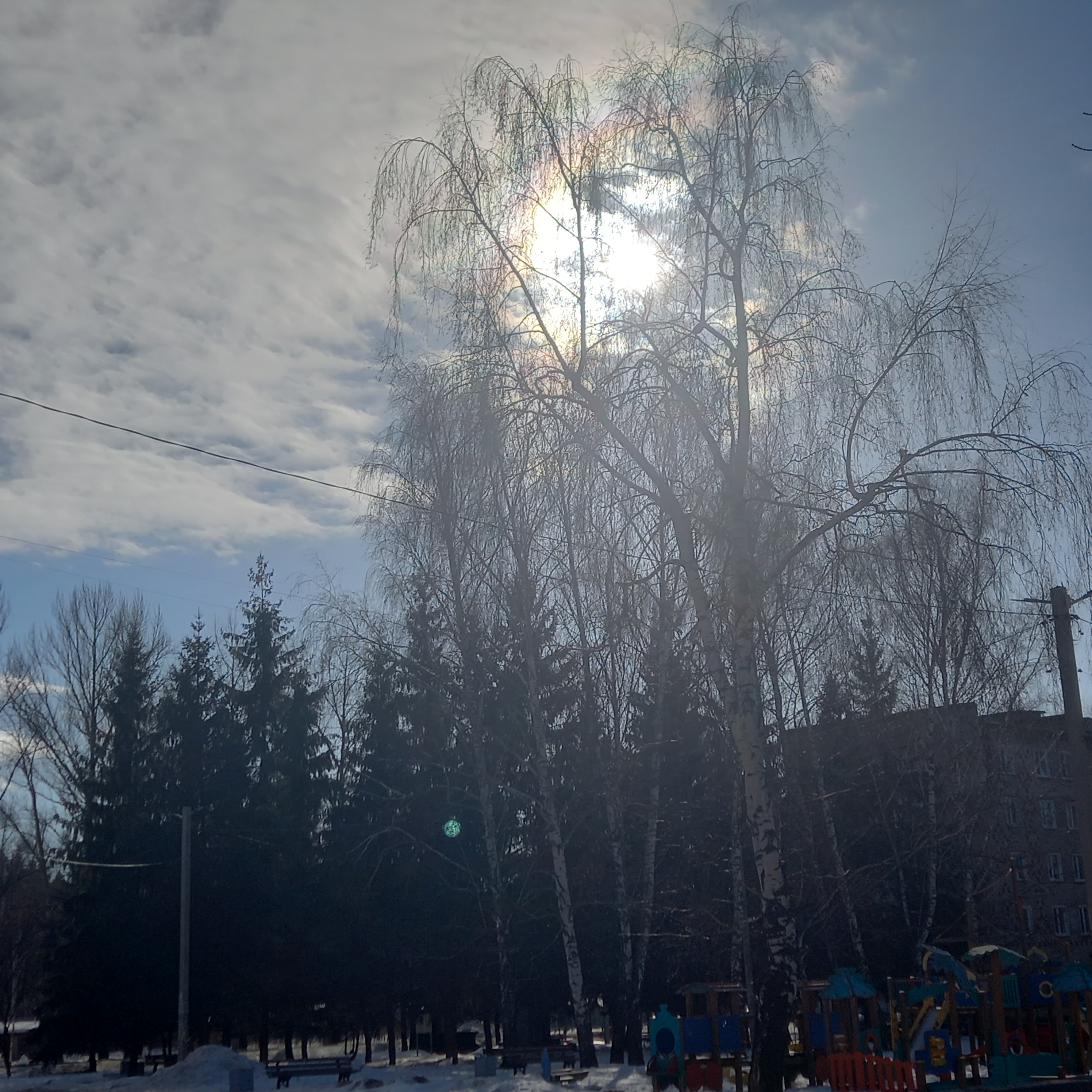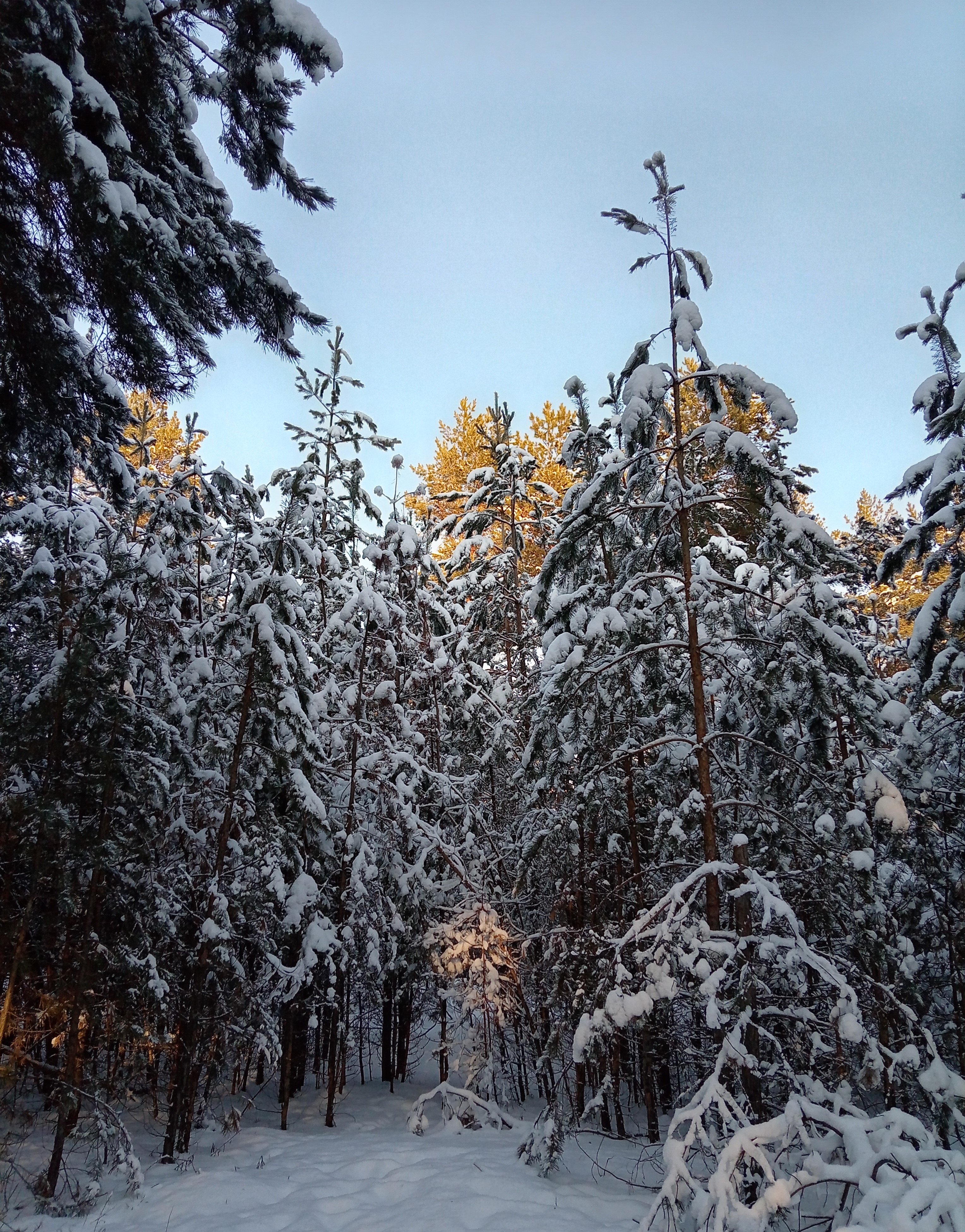 The light-filled tops of the pines