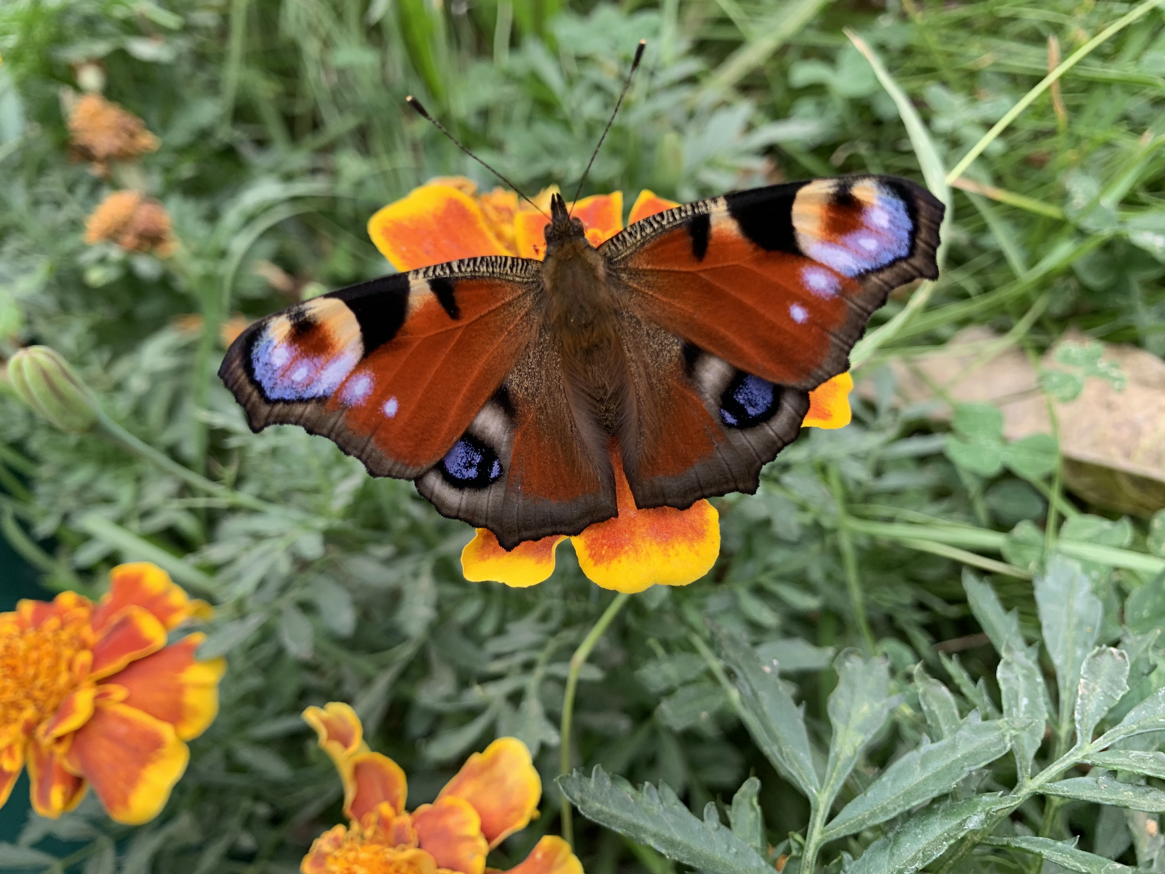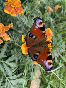 Peacock eye butterfly on marigolds