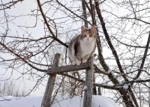 gato sentado en un árbol y mirando