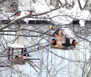 Зимняя трапеза:птица на ветке с яблоком