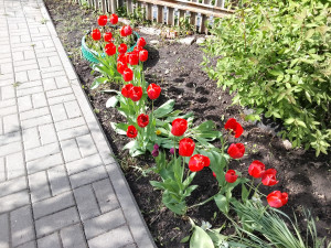 A path of red tulips