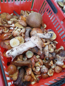 I'm with my grandmother in the forest, picking mushrooms and berries.
