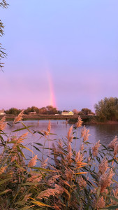 Rainbow on the background of sunset sky