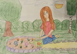 A girl waters flowers in a flower bed